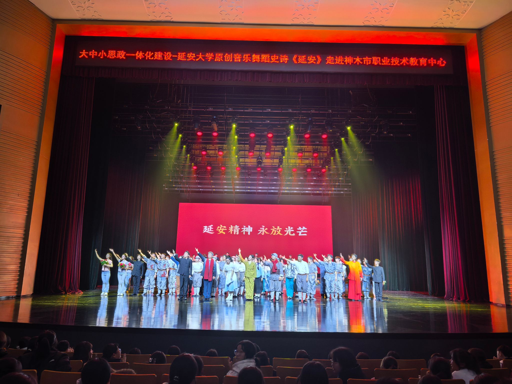 紧接着,10月23日晚至10月24日上午,《延安》剧组马不停蹄地为神木市职业技术教育中心的师生们献上了三场精彩演出。演出同样以“大中小思政一体化建设”为主题,通过音乐、舞蹈等多种艺术手段,将思政教育融入其中,使师生们在潜移默化中接受了革命传统教育和爱国主义教育。